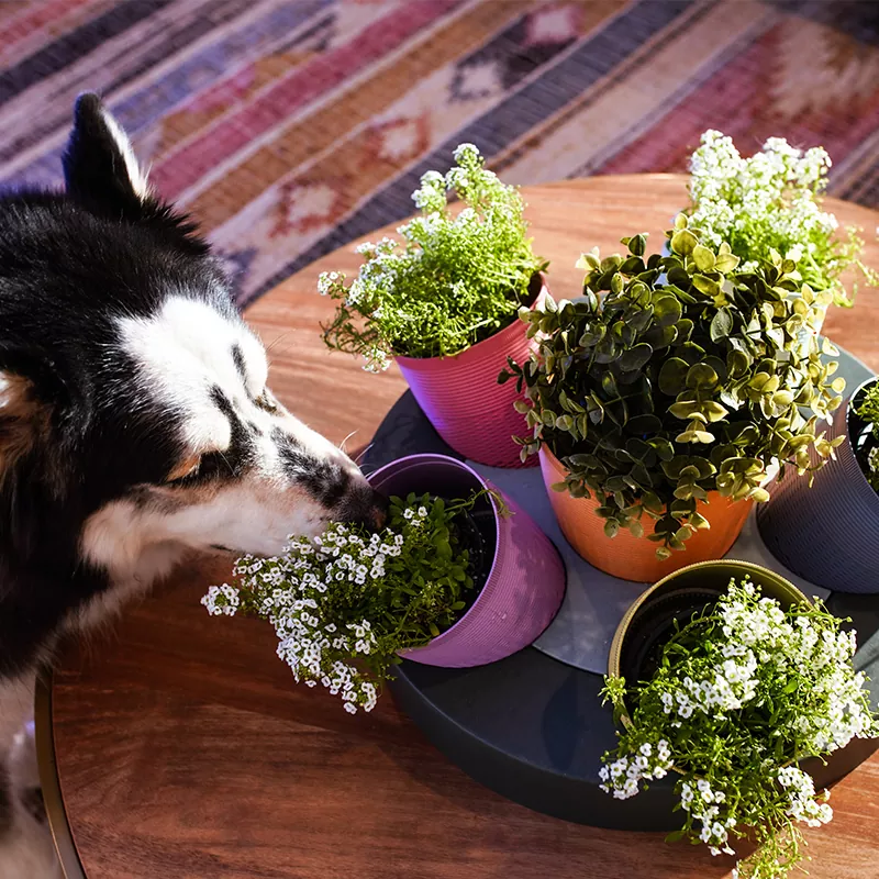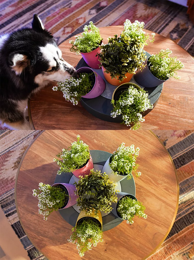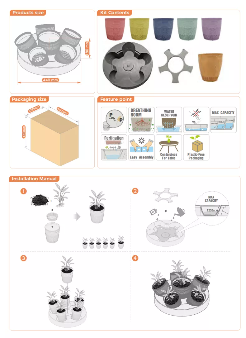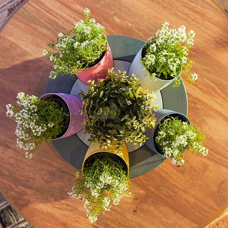 Eco Gardening Ronde Pot Planter De set componenten bestaat uit zes bloempotten met ademende bodems en een ronde basis voor wateropslag. Daaronder bevinden zich vijf 5'' bloempotten en één 6'' bloempot.