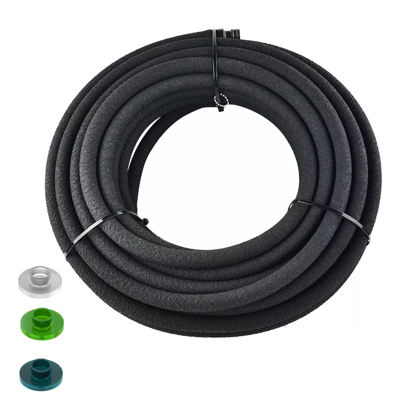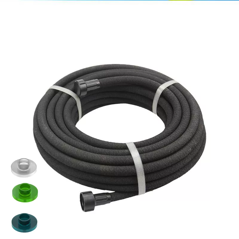 Kenmerken van de kwelslang: 1. Ruwe textuur met microporiën – De slangwand voelt grof aan en heeft talrijke fijne poriën voor een consistente waterafgifte. 2. Verstelbare stroomregeling – De wateropbrengst kan worden geregeld met behulp van stroombegrenzers (openingsplaten). 3. Emissie over de volledige lengte – De hele slang laat het water gelijkmatig ontsnappen, waardoor directe plaatsing langs de wortelzones van de plant mogelijk is voor gerichte irrigatie.