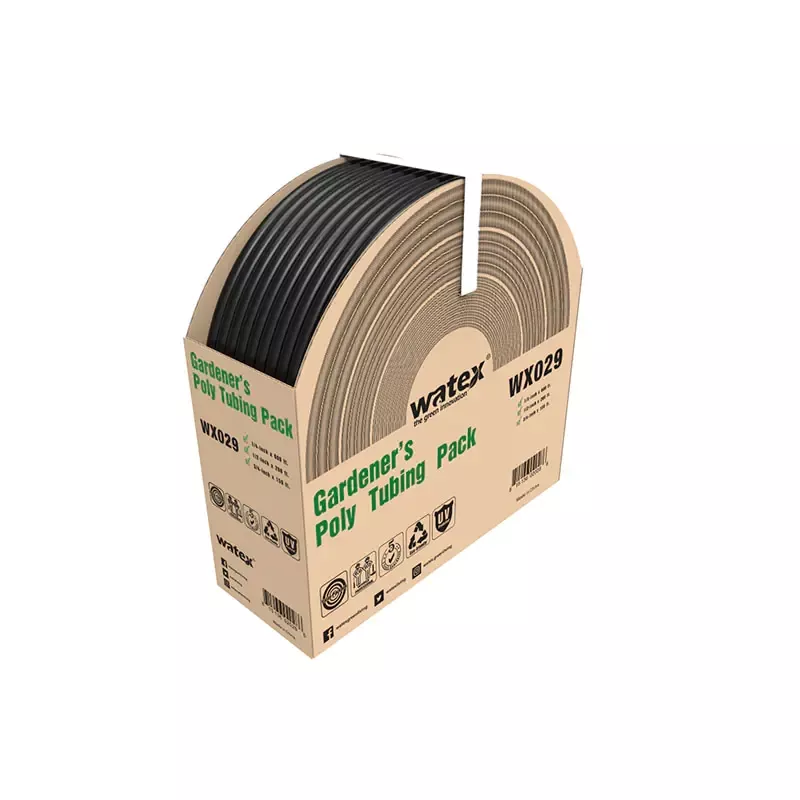 De serie PE/PVC-watertoevoerbuizen is duurzaam en toch flexibel en verkrijgbaar in binnendiameters van 4 mm, 13 mm, 19 mm en 25 mm. Het is gemakkelijk af te rollen en plat te leggen zonder in de war te raken, waardoor het ideaal is voor het plannen van leidingroutes vanaf de waterbron en het selecteren van de juiste leidingmaat op basis van de vereiste stroomsnelheden. Compatibel met Watex-fittingen en buisklemmen, waardoor snelle en gereedschapsloze verbindingen mogelijk zijn voor een probleemloze installatie. Het uiteinde kan worden aangesloten op capillaire irrigatiebuizen van 4 mm, waardoor het zeer geschikt is voor standaard lagedrukirrigatiesystemen.