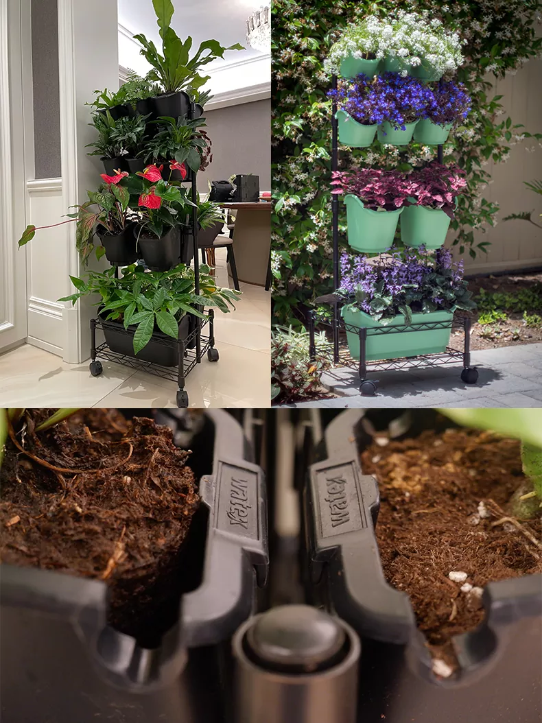 Ons metalen mobiele groene muur dubbele frame past perfect in het stadsleven en is uw vriend voor al uw behoeften op het gebied van stadstuinieren. De draagbaarheid van deze plantenbak met meerdere niveaus en een compleet irrigatiesysteem maakt hem ideaal voor ruimtebesparend tuinieren. Kweek je favoriete kruiden, groenten of bloemen of voeg wat luchtzuiverende planten toe om de lucht in je huis te zuiveren en ze overal mee naar toe te nemen.