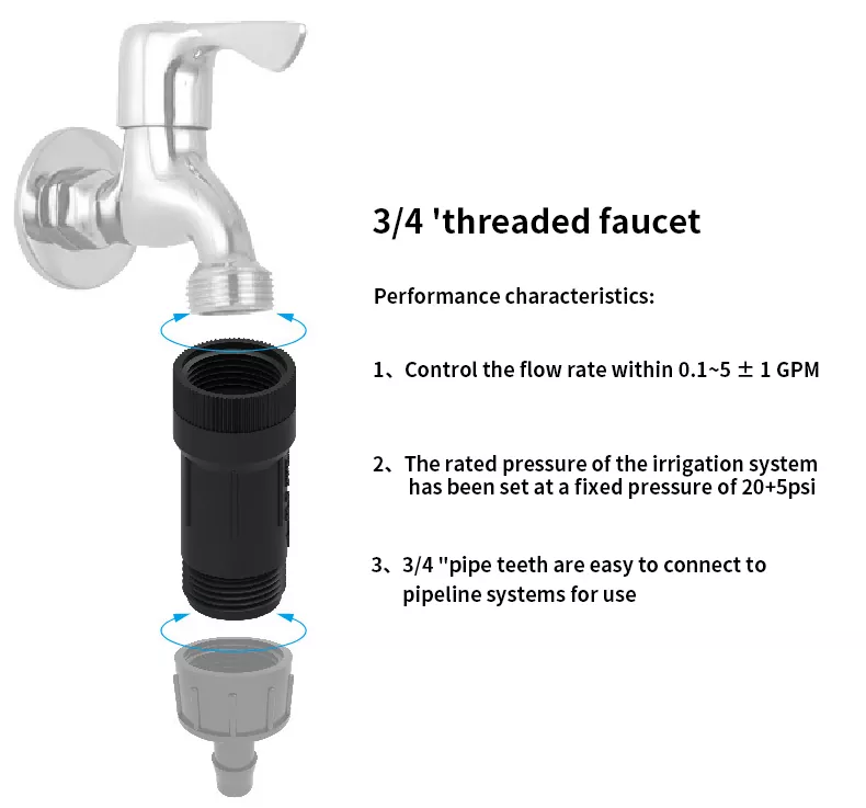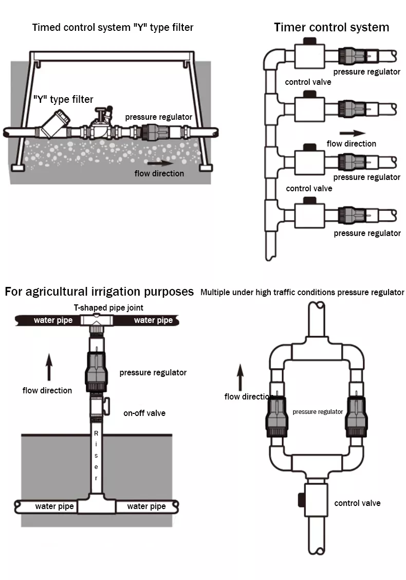 De drukregelaar is geschikt voor zowel binnen als buiten 13 mm/19 mm/25 mm irrigatiesystemen. De primaire functie is het stabiliseren van de waterdruk en -stroom door het reguleren van variërende inlaatdrukken, waardoor een consistente output wordt gegarandeerd voor eindpuntdruppelirrigatie, sprinklersystemen en andere irrigatietoepassingen met laag debiet. Het is compatibel met alle soorten druppelirrigatie, systemen met een laag debiet en mobiele sprinklermachines, waardoor het ideaal is voor waterbesparende irrigatieopstellingen.