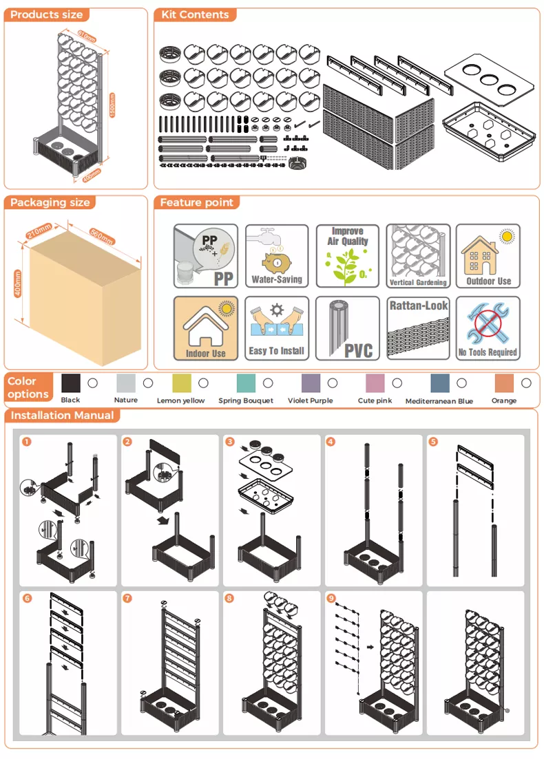 De door Watex leverancier geproduceerde vrijstaande Patio Vertical Garden meet 61*40*155cm (lengte * breedte * hoogte), wordt geleverd met 18 #1 specificatie bloempotten (elke potmaat 13,7 x 16,5 x12,5 cm), en heeft een zelfbewaterend capillair tuinbed. Het kan direct in gebruik worden genomen zonder extra aanpassingen, wat zowel tijd als moeite bespaart.
