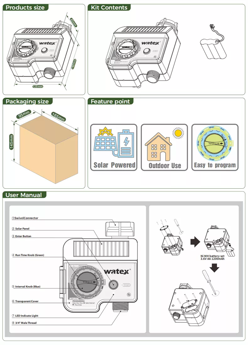 Vergeleken met vergelijkbare producten is het voor de op zonne-energie werkende taptimer niet nodig om de batterijen regelmatig te vervangen (bij normaal gebruik). Het is milieuvriendelijk en energiezuinig. Hij heeft voldoende kracht en is duurzaam, waardoor het een bewateringsapparaat is waarmee u met een gerust hart op zakenreis kunt gaan.
